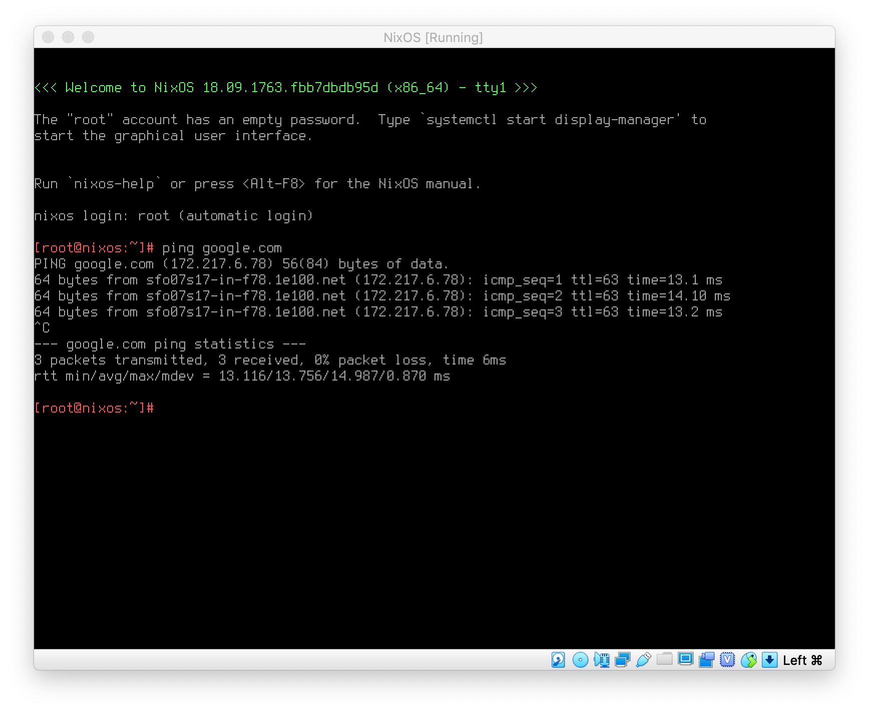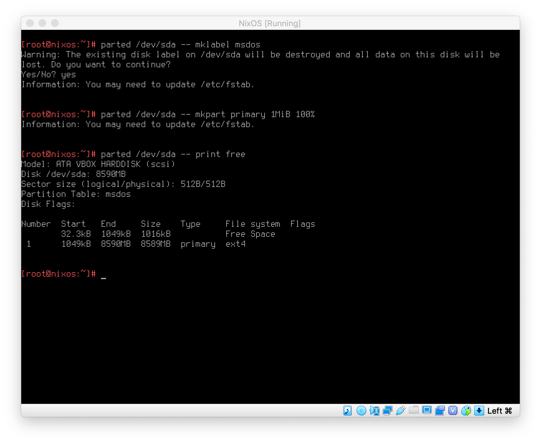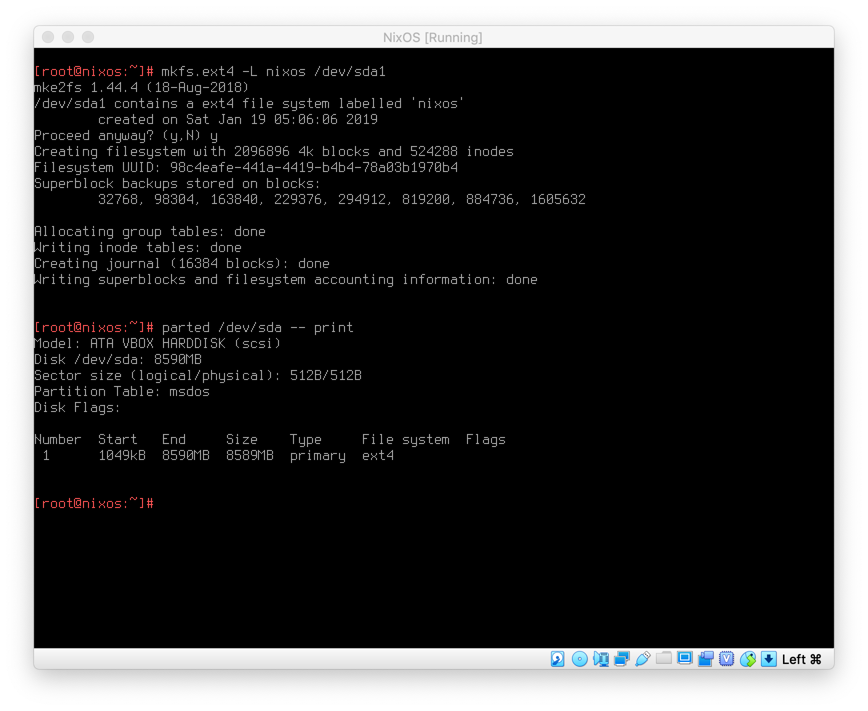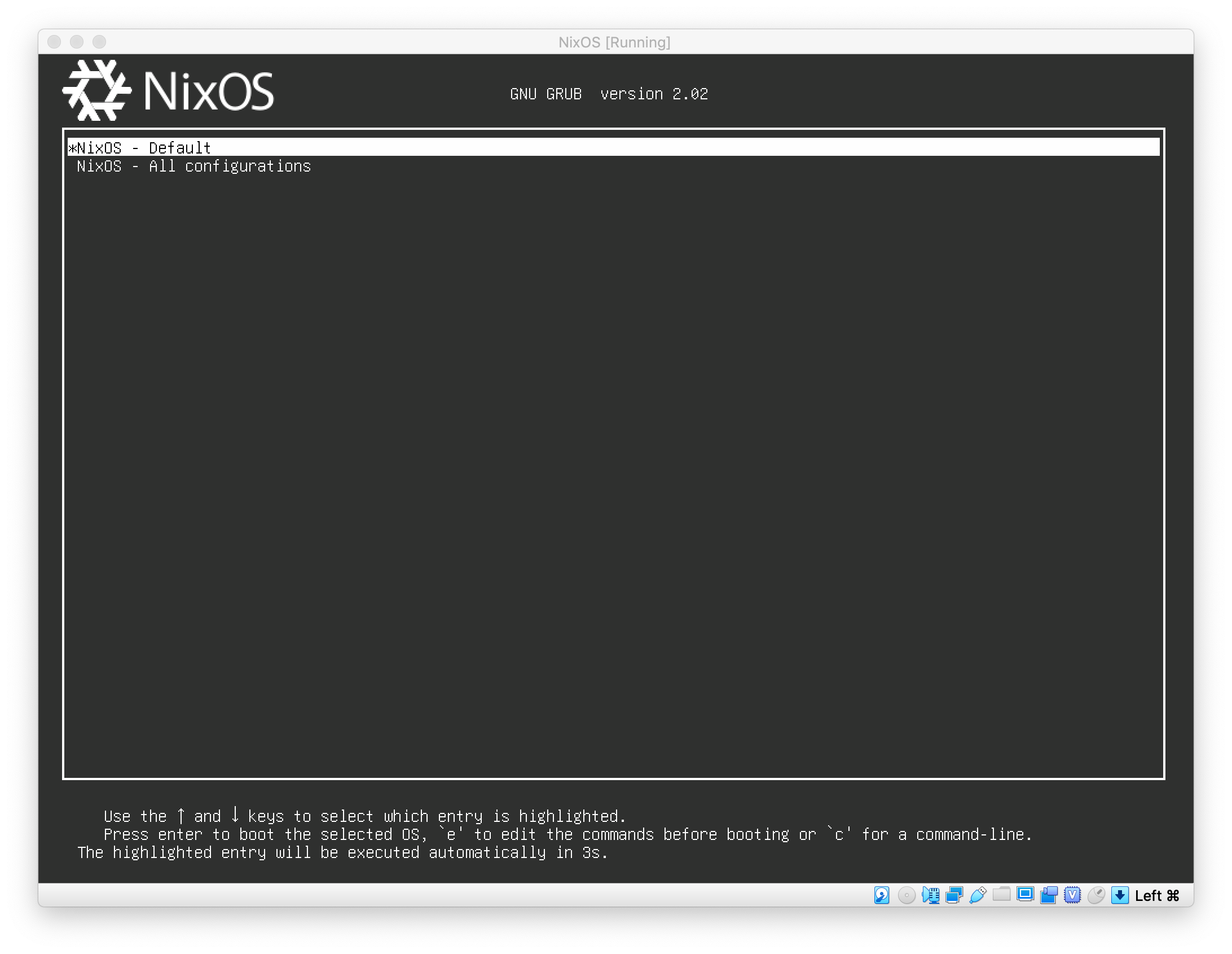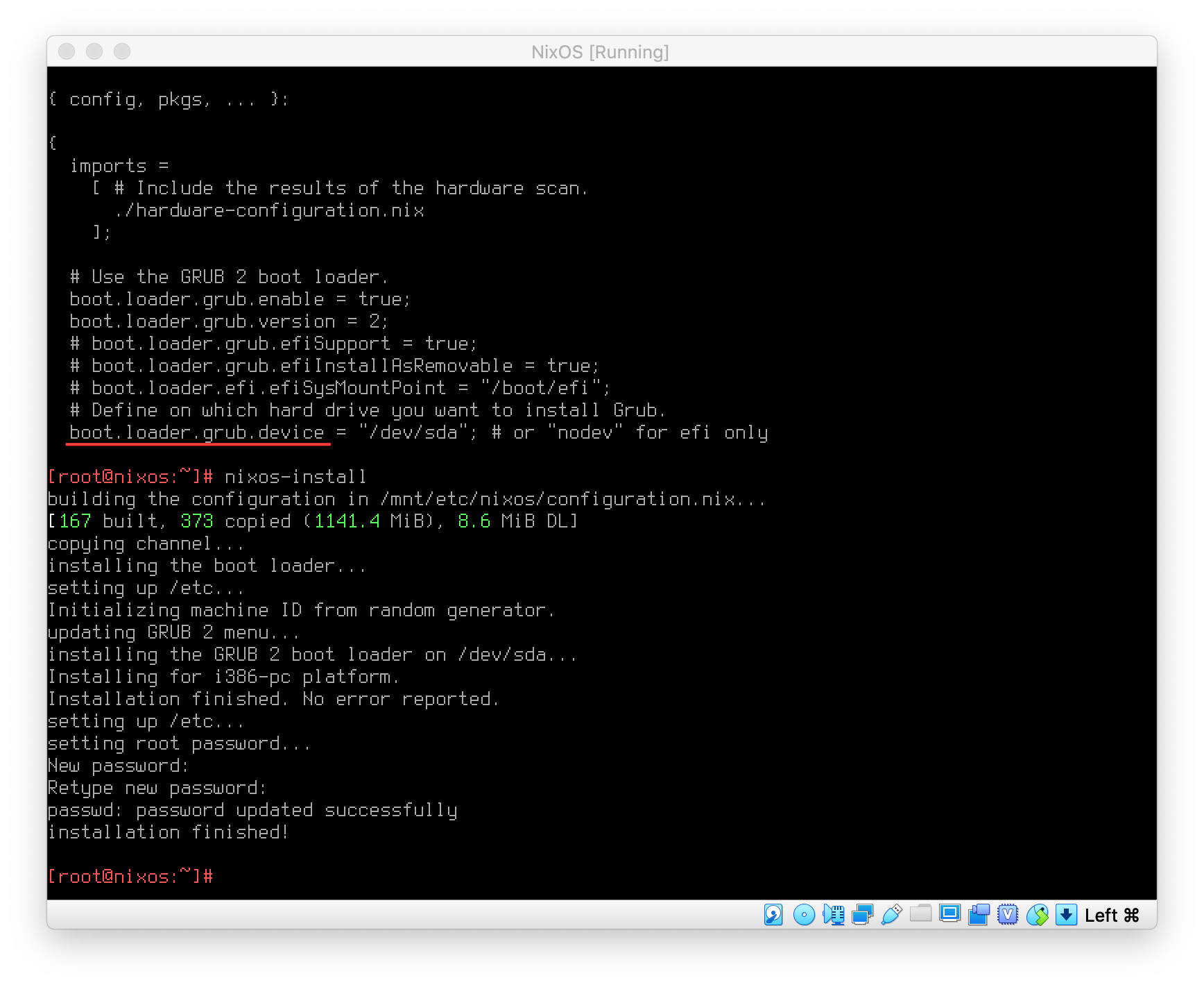 Now you have a very basic NixoS installation. You may wish to read my next post as well, where I set up i3 and install a few appications to make the install more usable.