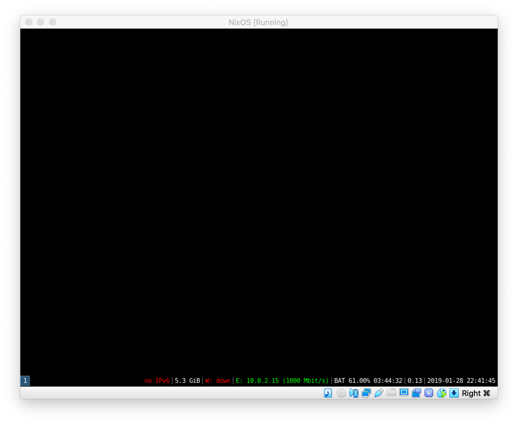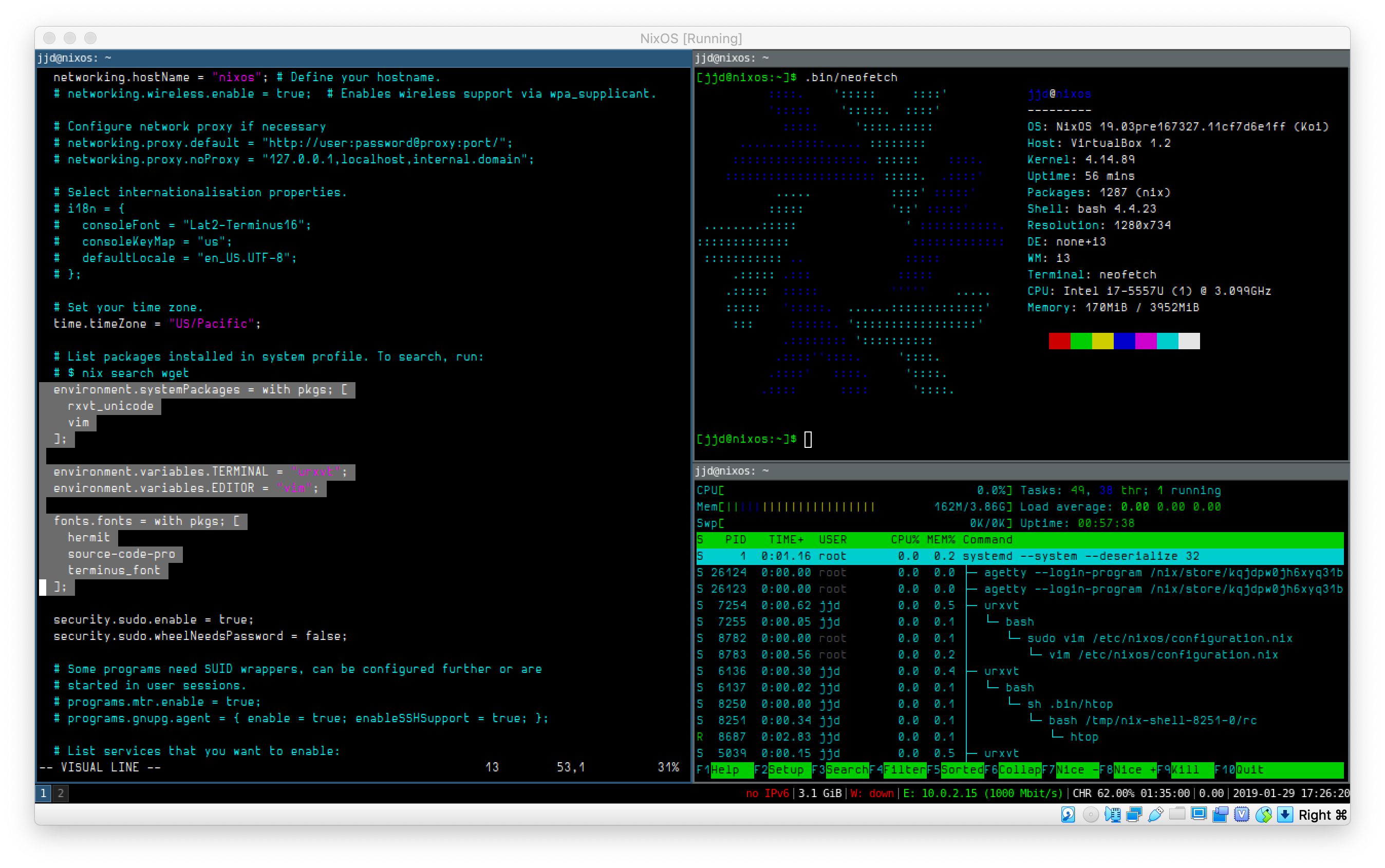 URxvt.scrollBar: falseNote: The hermit font is in the unstable nixpkg repo. If you didn’t follow to previous terminal and are getting an “undefined variable” error, you likely need to run this: